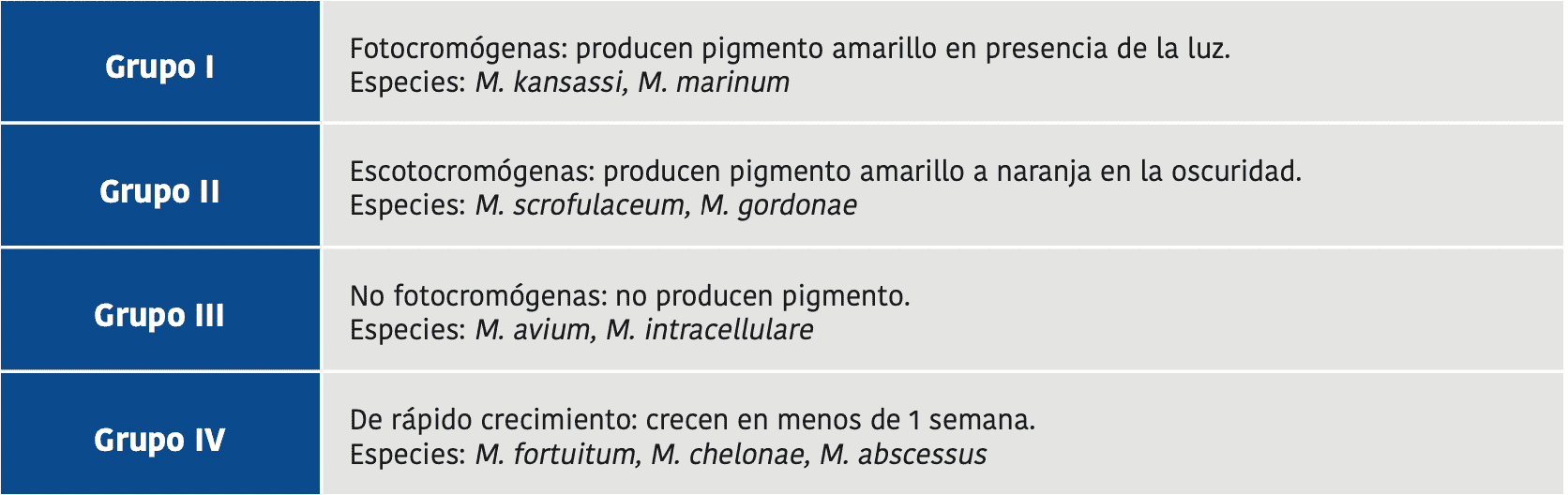 En 1950 apareció la clasificación de micobacterias, propuesta por Timpe y Runyon, que se basa en sus características de crecimiento y pigmentación. Esta nomenclatura ha facilitado la identificación y estudio de estos microorganismos (cuadro 1).1