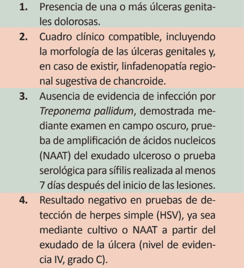 Según los Centros para el Control y la Prevención de Enfermedades (CDC), puede establecerse un diagnóstico probable de chancroide —tanto a nivel clínico como para fines de vigilancia epidemiológica— si se cumplen los siguientes criterios que se presentan en el cuadro 2.