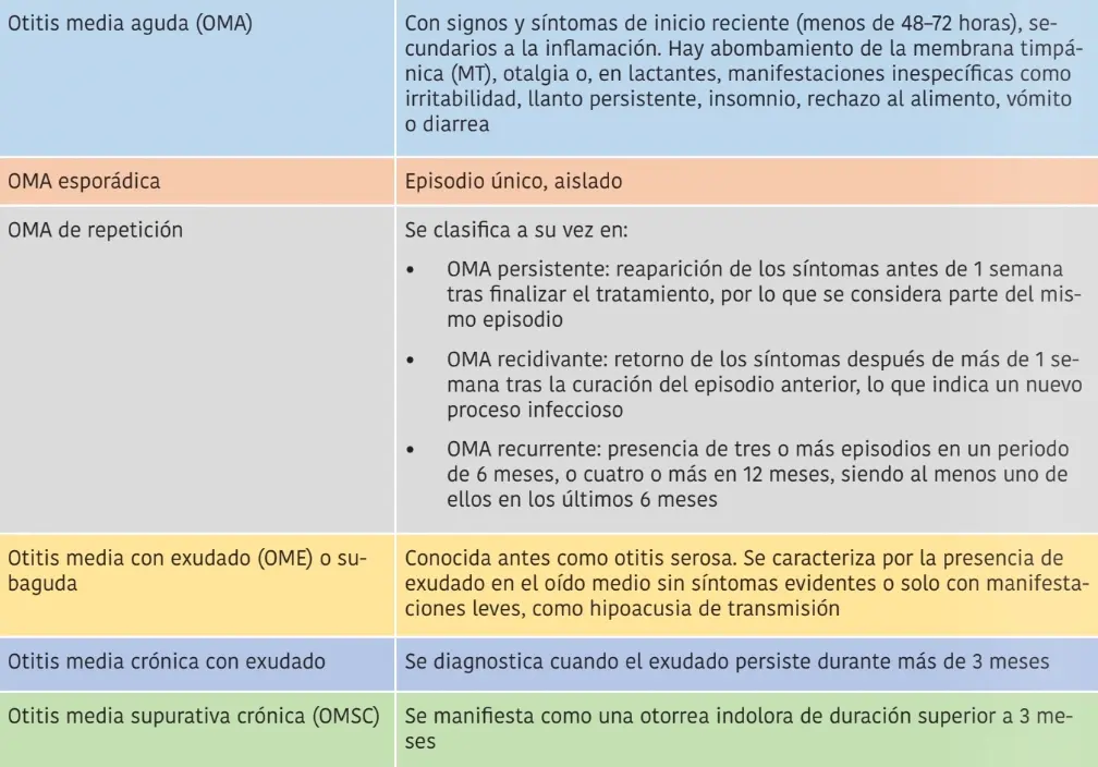 La otitis media (OM) se define como la presencia de exudado (seroso, mucoso, purulento o mixto) en el oído medio. Dependiendo del tiempo de evolución de dicho exudado y de la presencia o no de síntomas, se distinguen varias formas clínicas, que se presentan en el cuadro 1.2