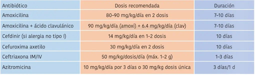 • Niños de 6 a 24 meses con OMA bilateral, síntomas severos (otalgia intensa o fiebre ≥39 °C) o diagnóstico certero
