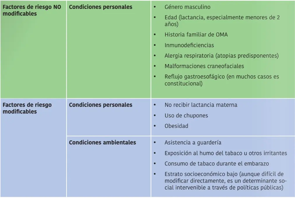 Entre los factores de riesgo no modificables se incluyen edad temprana, género masculino, nacimiento prematuro, inmunodeficiencias, atopia, disfunciones anatómicas (como alteraciones de la trompa de Eustaquio o anomalías craneofaciales), así como antecedentes genéticos.6,10