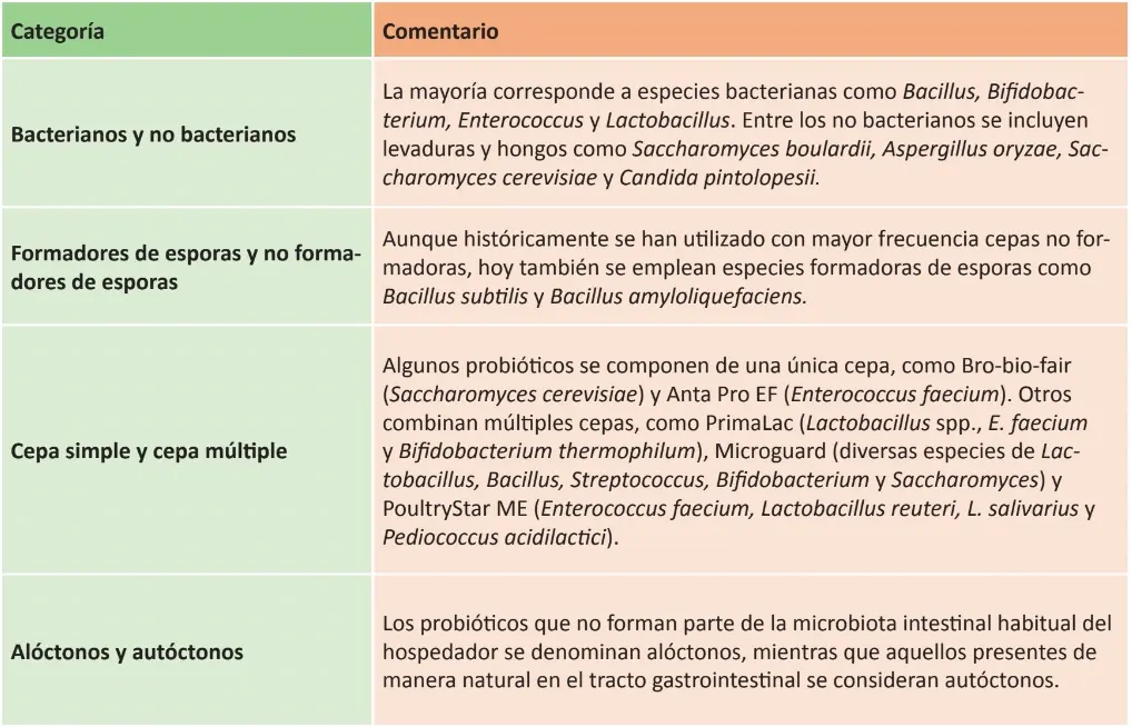 Actualmente, los microorganismos empleados como probióticos se clasifican en diferentes categorías, que se presentan en el cuadro 1.
