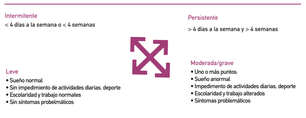 La clasificación actual de la rinitis alérgica de acuerdo al documento ARIA (Allergic Rhinitis and its Impact on Asthma) se basa en el tiempo de presentación y gravedad de los síntomas, así como la afectación de la calidad de vida: 1